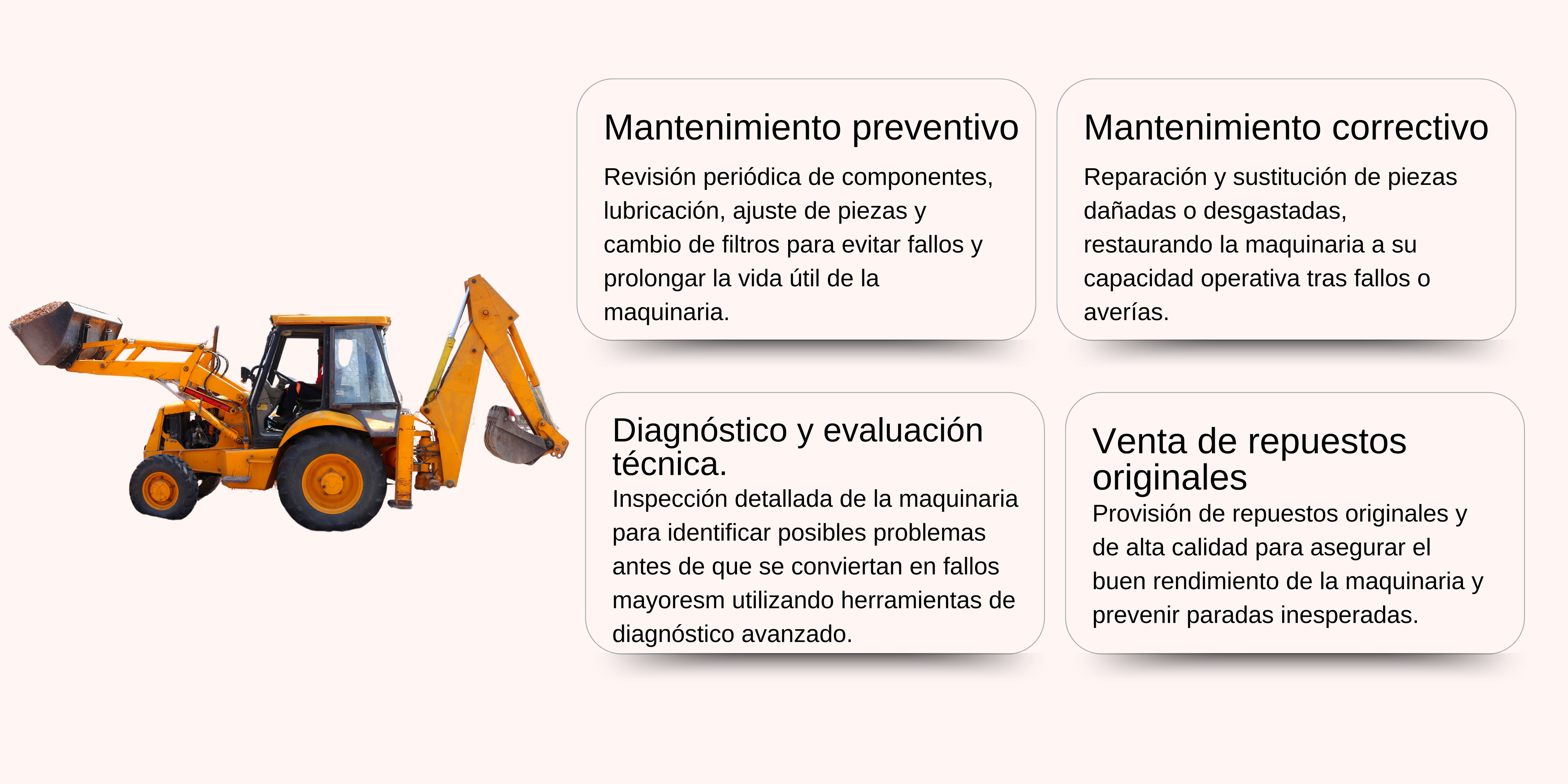 Ofrecemos una gama completa de servicios para maquinaria amarilla, incluyendo venta de repuestos y servicios técnicos especializados tanto correctivos como preventivos. Nuestro objetivo es garantizar que su maquinaria funcione de manera eficiente y sin interrupciones, maximizando su productividad en cada proyecto.