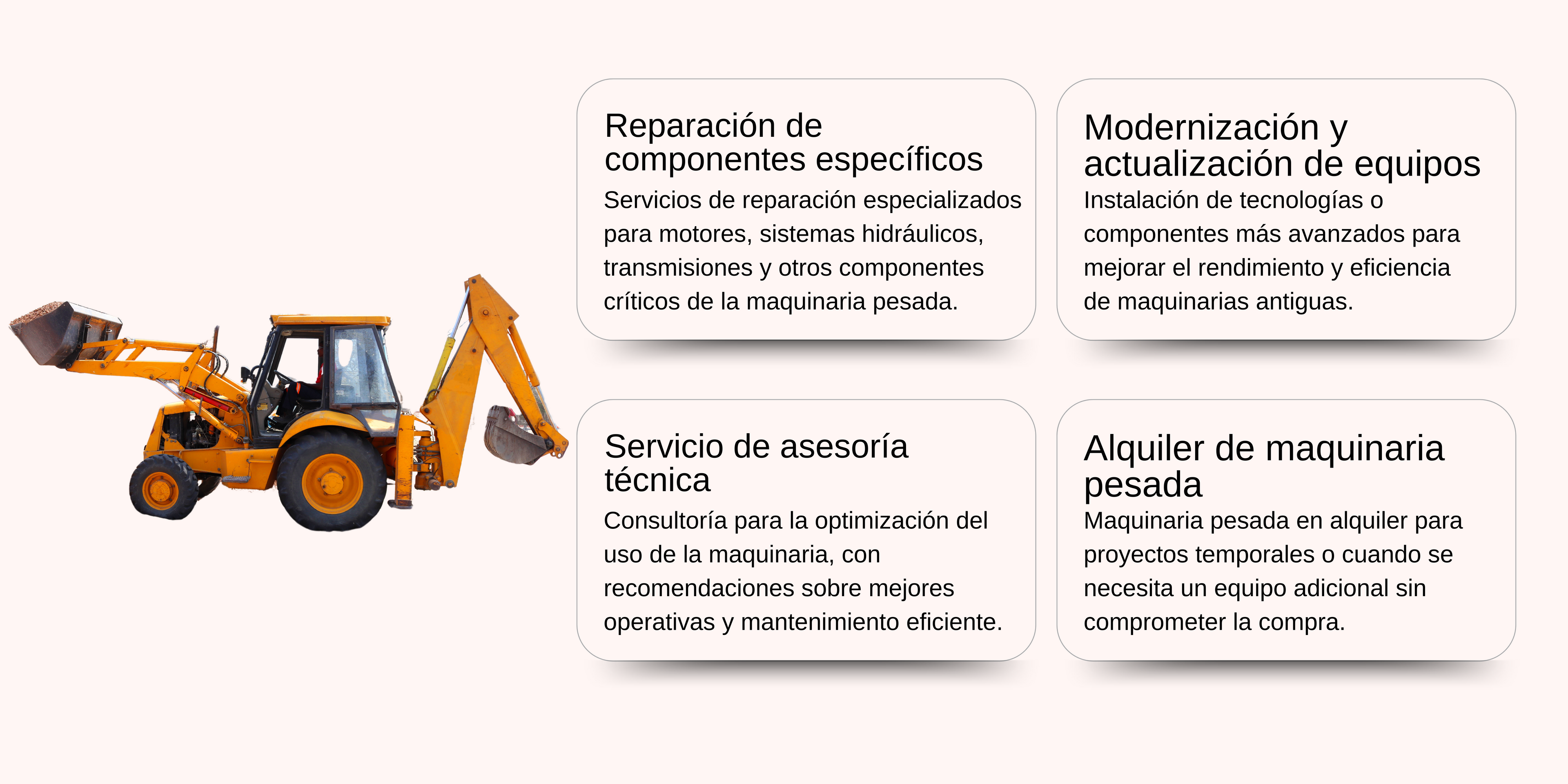 Atendemos una amplia gama de maquinaria pesada, incluyendo excavadoras, cargadores, retroexcavadoras, bulldozers, y grúas, entre otros.